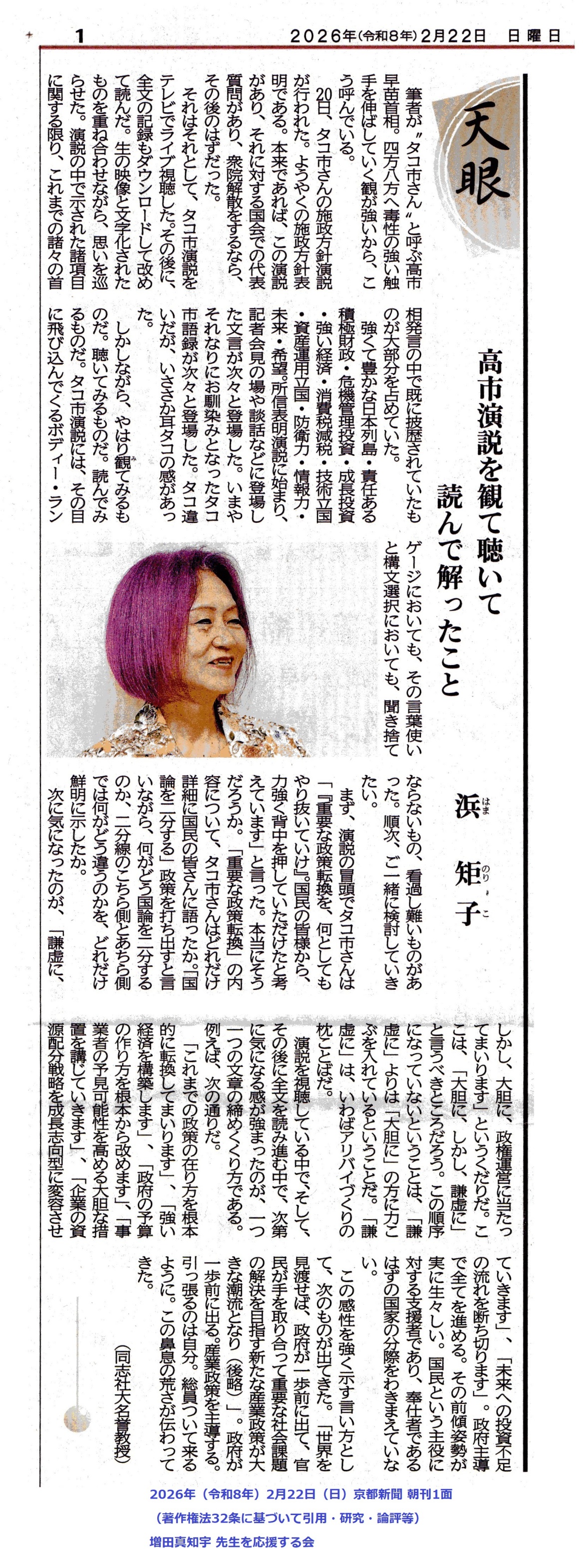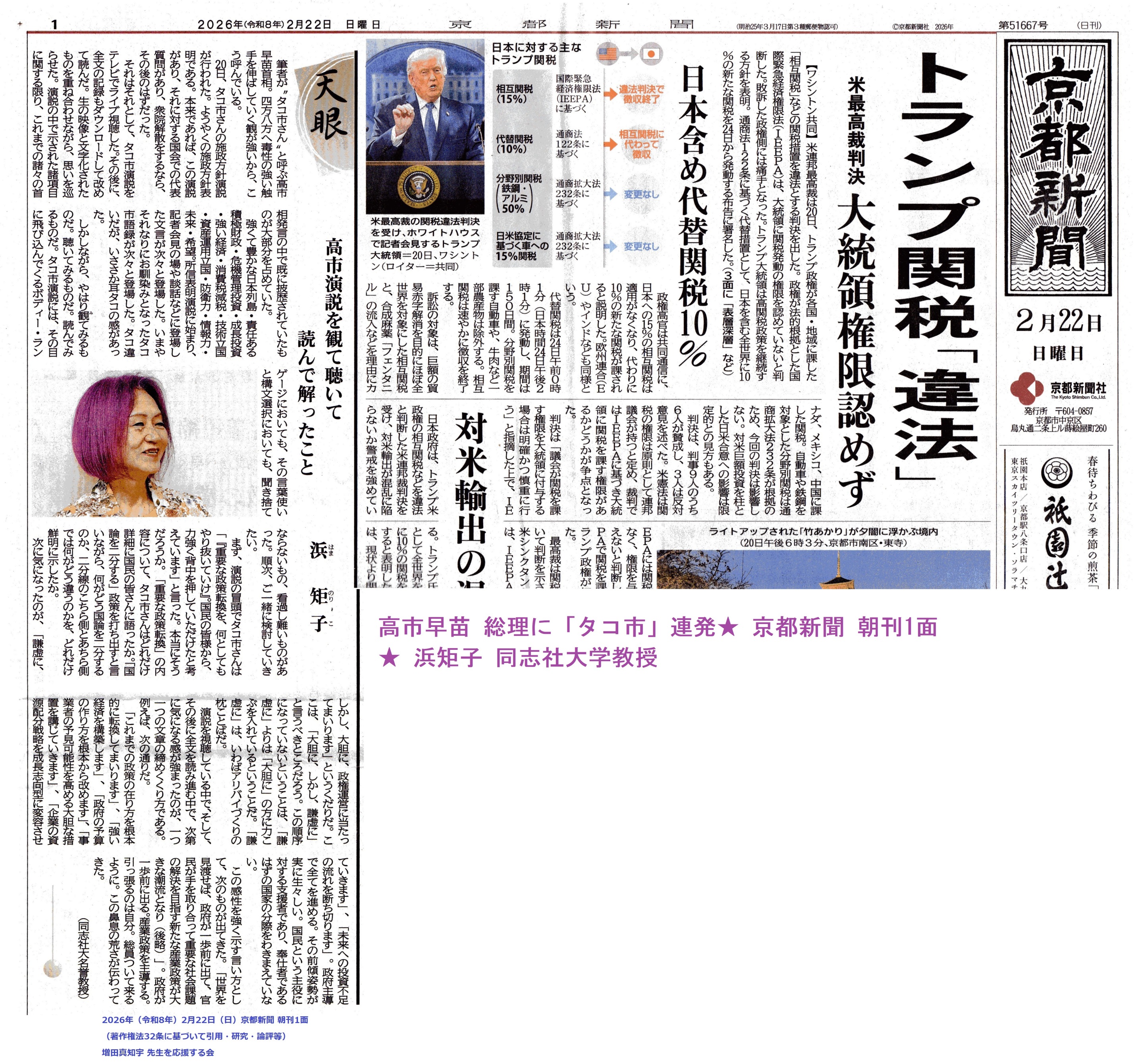 高市早苗 総理に「タコ市」連発★ 京都新聞 朝刊1面★ 浜矩子 同志社大学教授